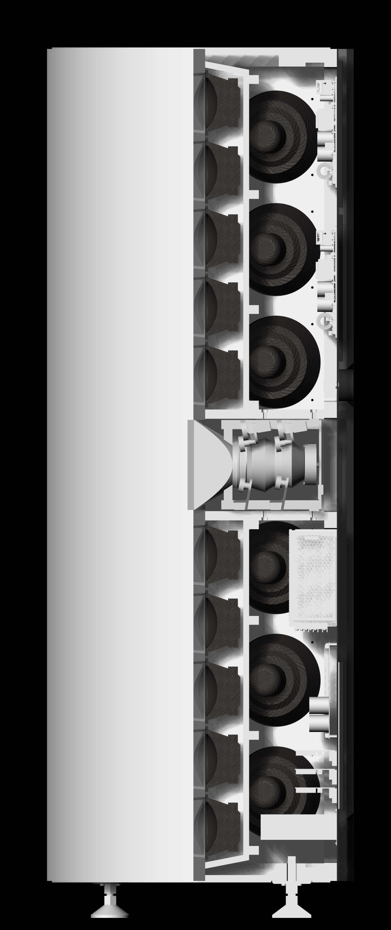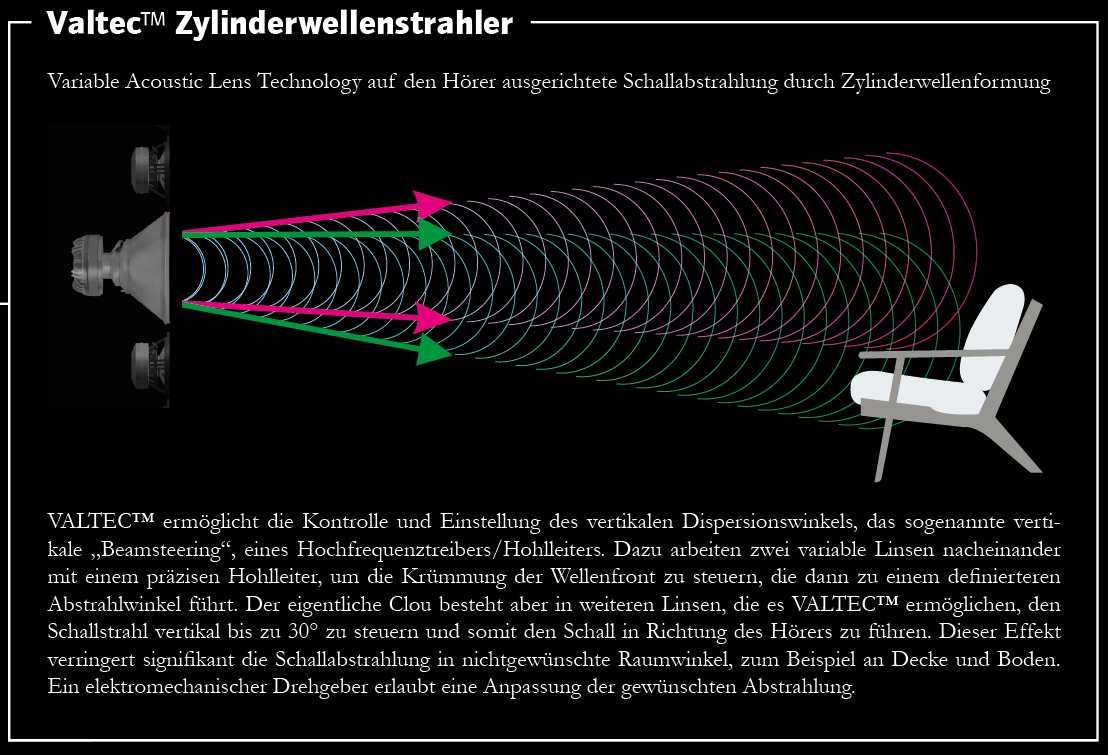 Technisch realisiert wird dieses Konzept durch das neu entwickelte, patentierte VALTEC™ Mittel-Hochtonsystem. Anders als bei elektronischem Beamsteering kommen hier keine digitalen Verzögerungen zum Einsatz, sondern eine komplexe, rein akustische Schallführung über variable Akustiklinsen. Der entscheidende Vorteil: Das Beamsteering funktioniert auch außerhalb der Hauptachse (Off-Axis) vollkommen fehlerfrei.