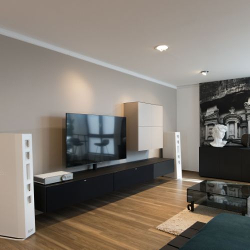 Das Design der Jubilés mit der abgeschrägten Schallwand, den eleganten, fugenlosen Gehäusen, mit ihrer schlanken, eleganten Silhouette, die leicht über dem Sockel schwebt, verleiht ihnen eine Einzigartigkeit, die herkömmliche Wohnzimmerlautsprecher weit hinter sich lässt. Durch den optischen Verzicht auf rein technische Lautsprecherelemente wie Sicken, Schrauben oder Ähnliches entsteht ein Klangmöbel, das jedes Wohnambiente bereichert.
