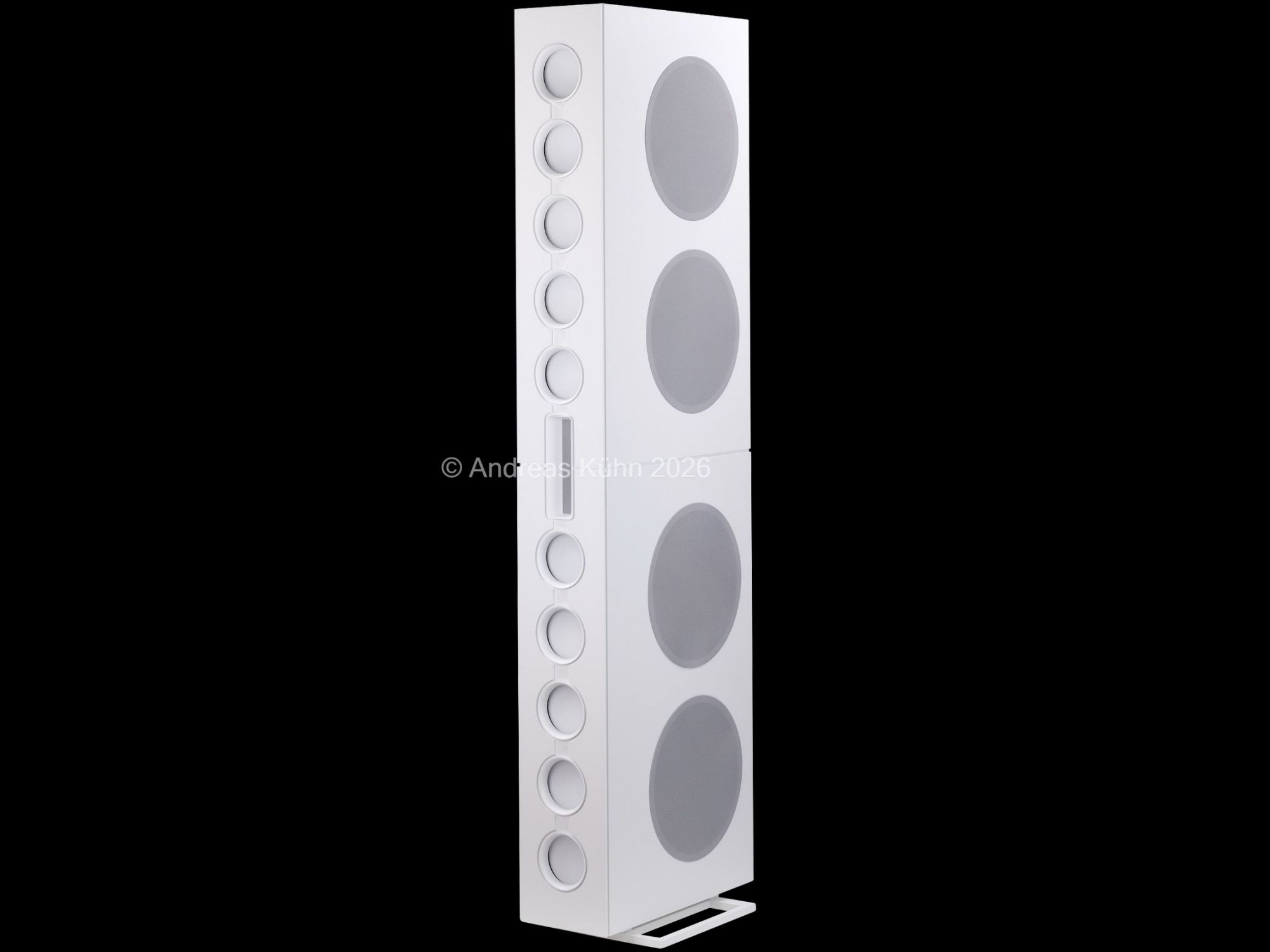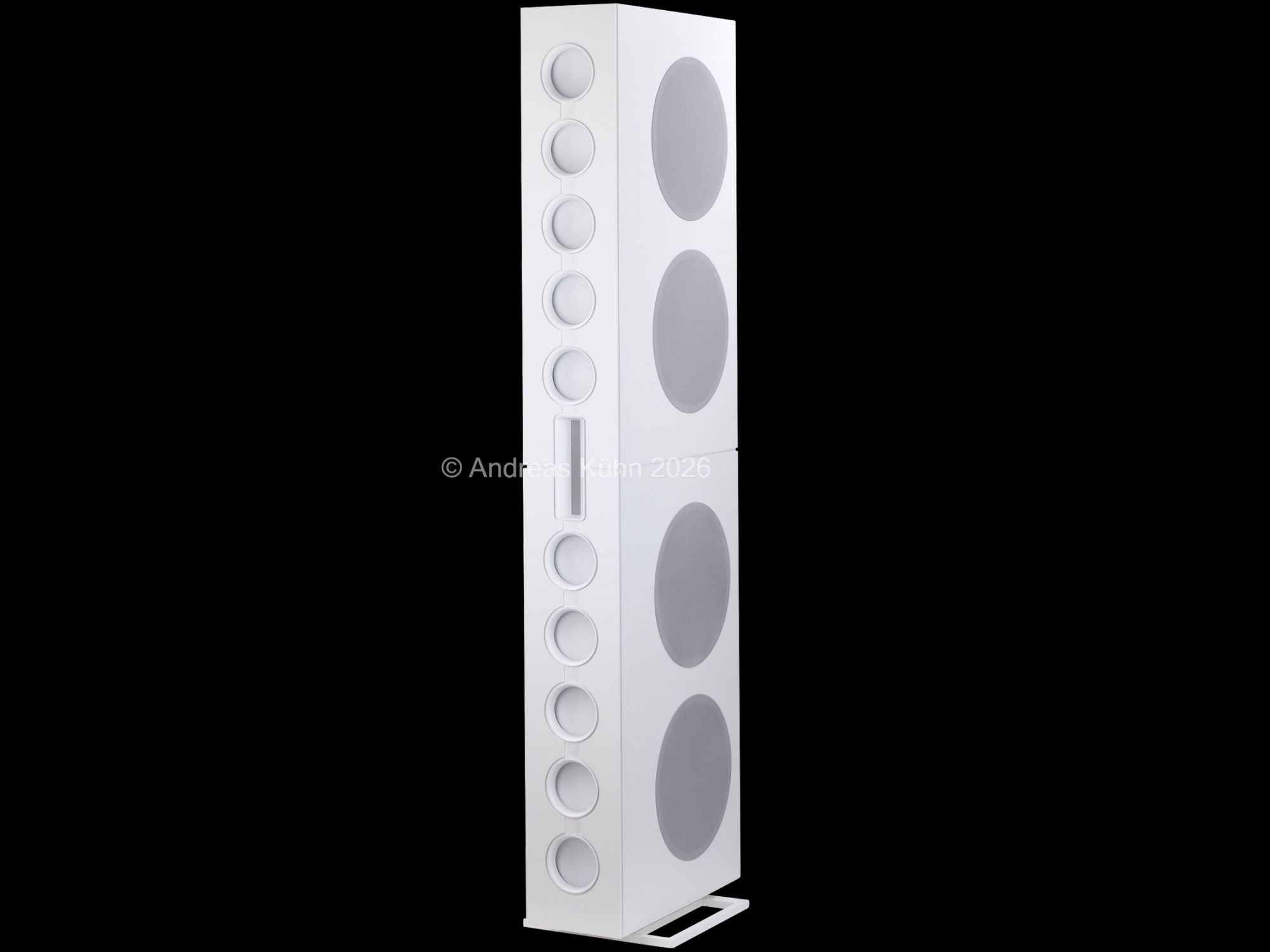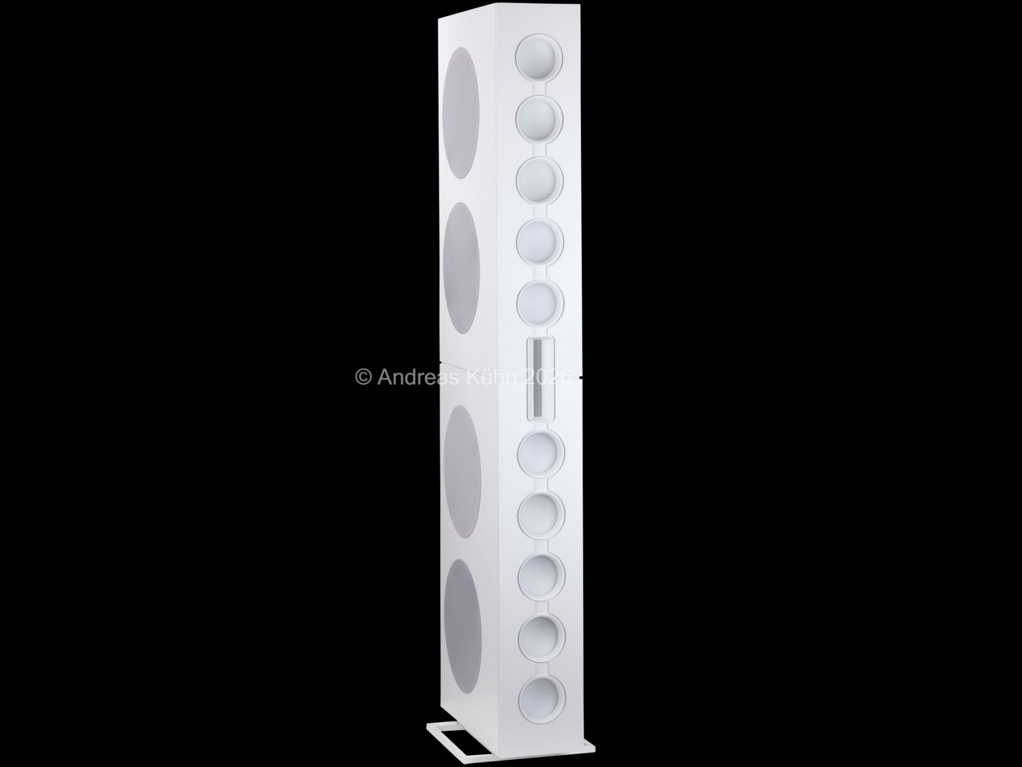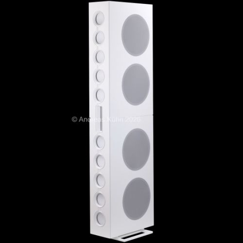 Der Bassbereich wird von mehreren großformatigen, sensorgeregelten Tieftönern übernommen. Die integrierte Regelung überwacht permanent die tatsächliche Membranbewegung und korrigiert sie in Echtzeit. Dadurch bleibt der Bass nicht nur tiefreichend und kraftvoll, sondern vor allem präzise und frei von Aufdickungen, selbst bei hohen Pegeln oder geringer Lautstärke.